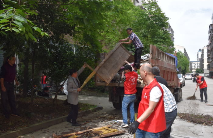 在公司党员带领下,员工们个个干劲十足,将长期遗弃堆放在小区里的杂物和垃圾抬上车装到垃圾填埋场,